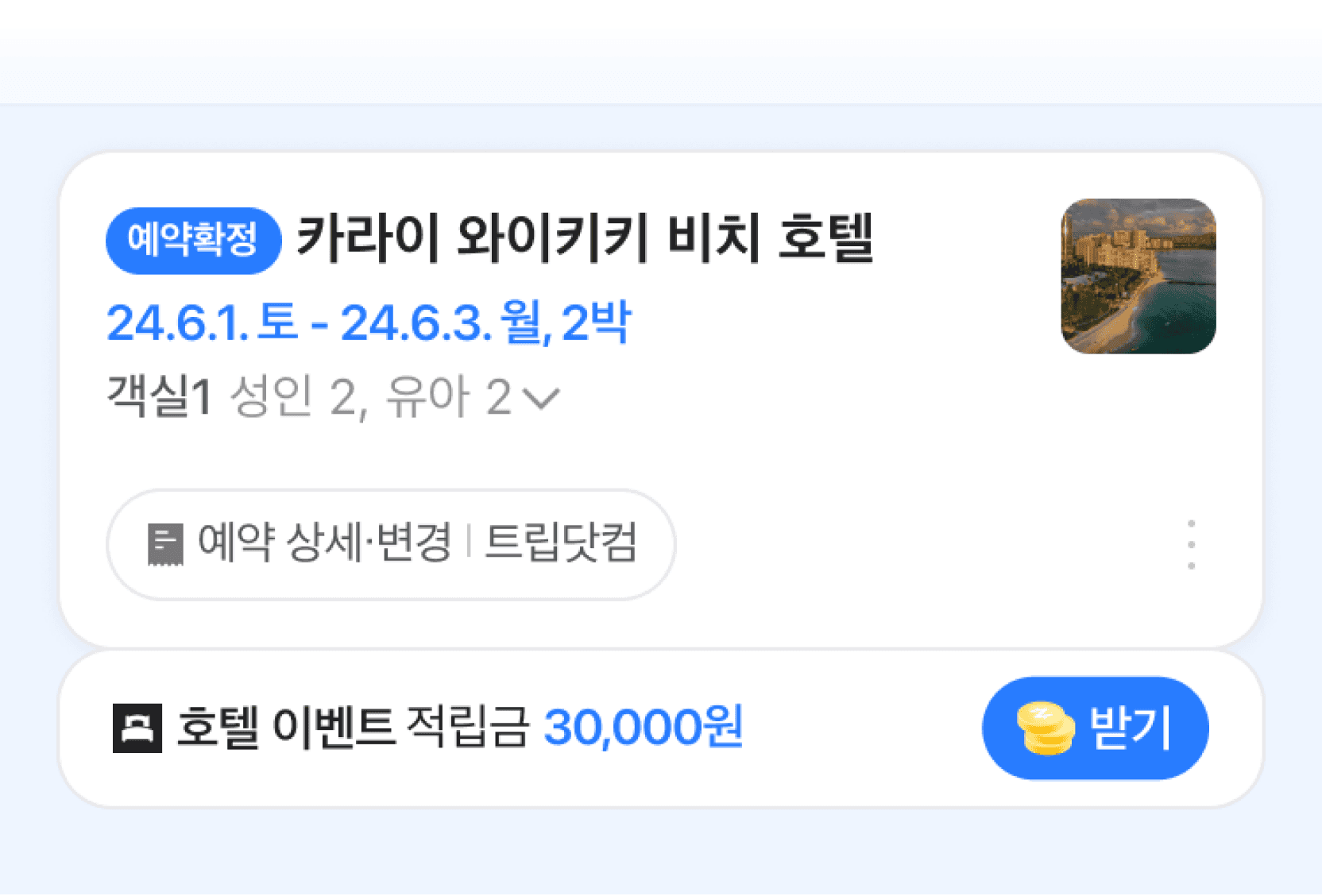 투숙 완료 후, 여행 마이페이지에서 '적립 받기' 버튼을 눌러 적립금을 받을 수 있습니다.