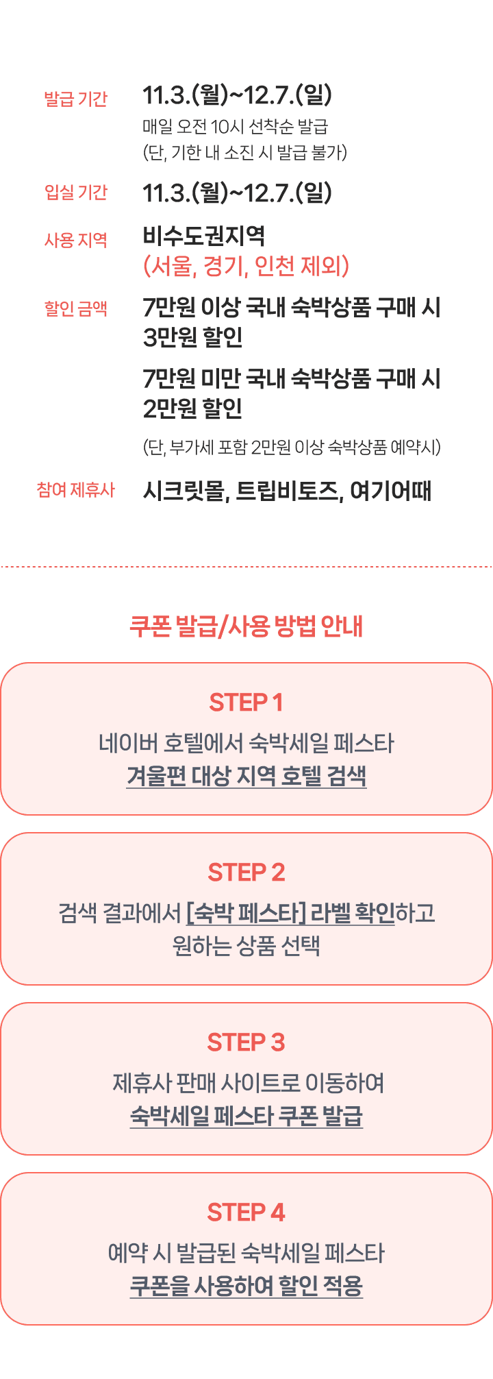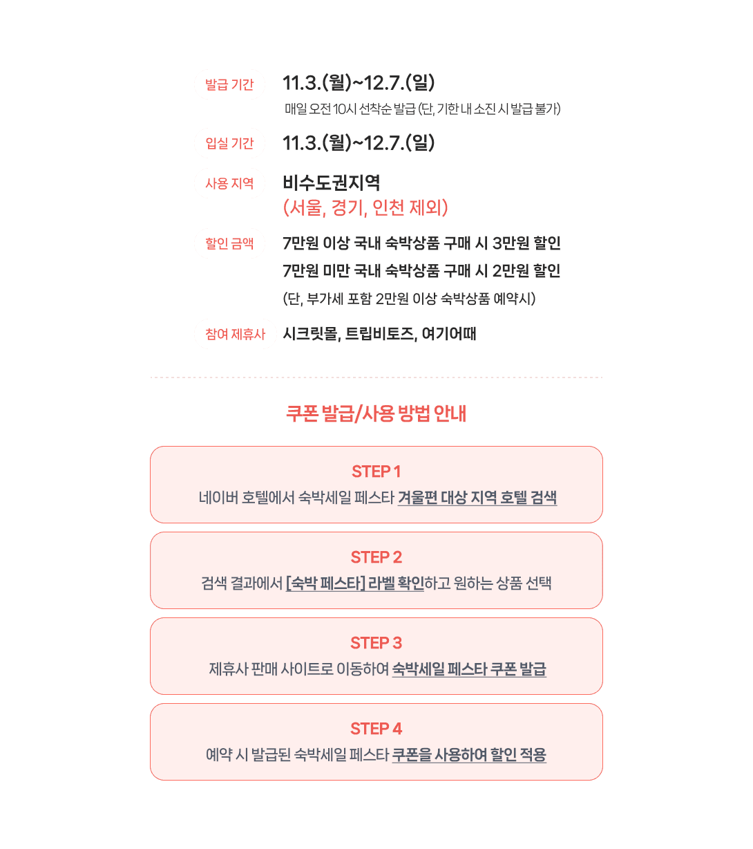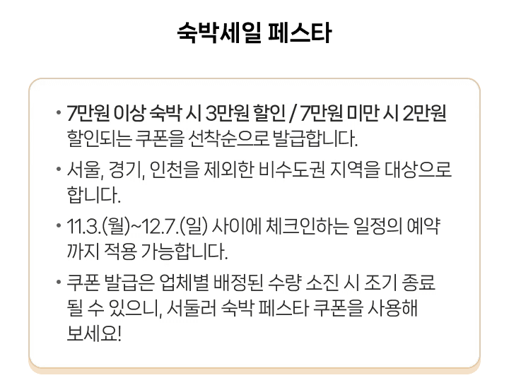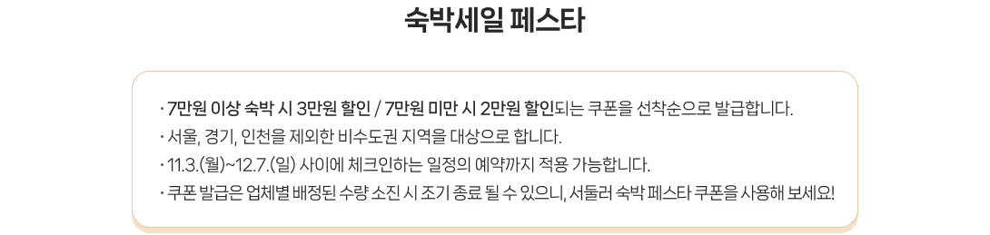 숙박세일 페스타 프로모션은 쿠폰 수량 소진 되거나, 감염병 재확산과 같은 상황으로 정부의 긴급 사업중단 등으로 조기 종료될 수 있습니다.