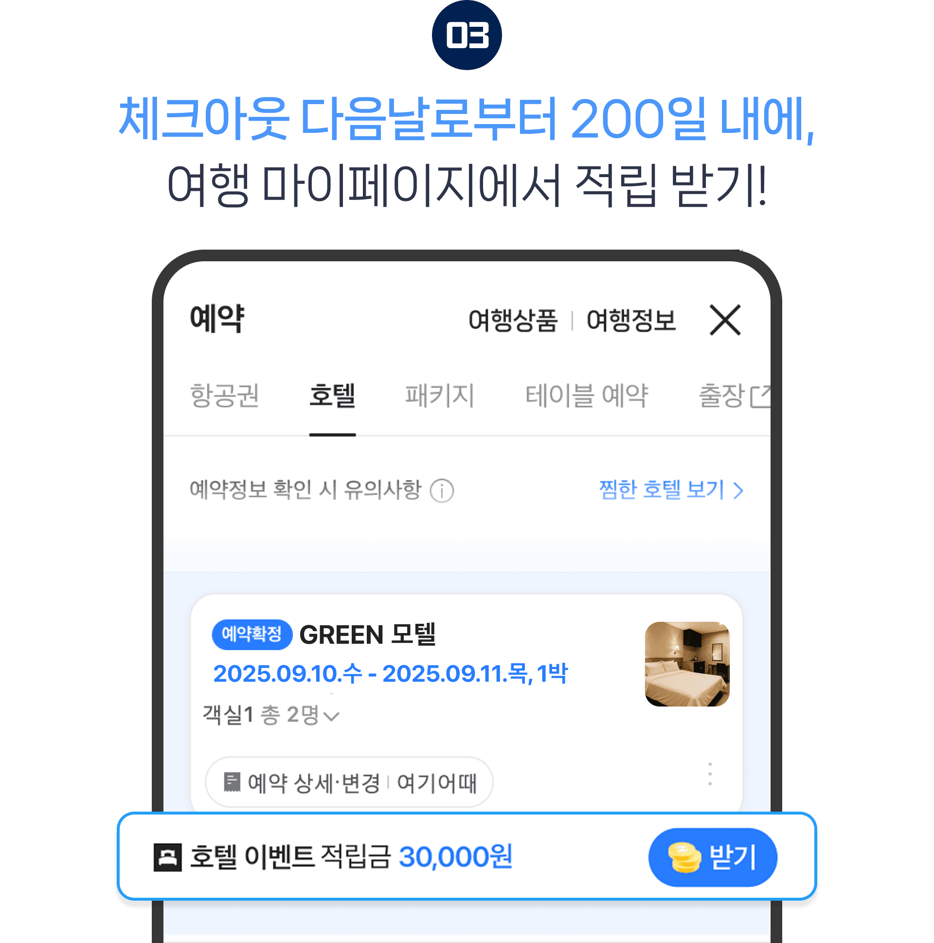 여행 마이페이지에서 ‘적립 받기’ 버튼 클릭하여 적립 완료 (체크아웃 다음날부터 200일 동안 적립 받기 가능)