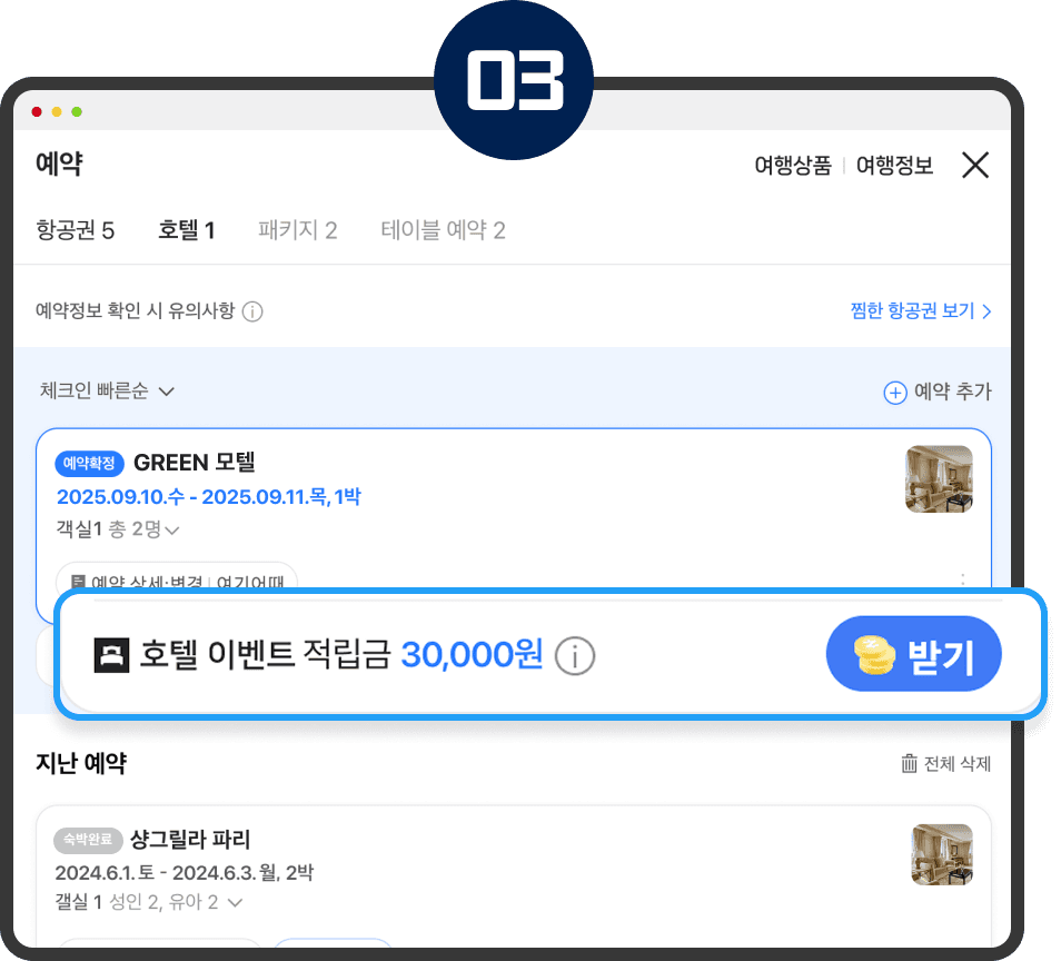 투숙 완료 후, 여행 마이페이지에서 '적립 받기' 버튼을 눌러 적립금을 받을 수 있습니다.
