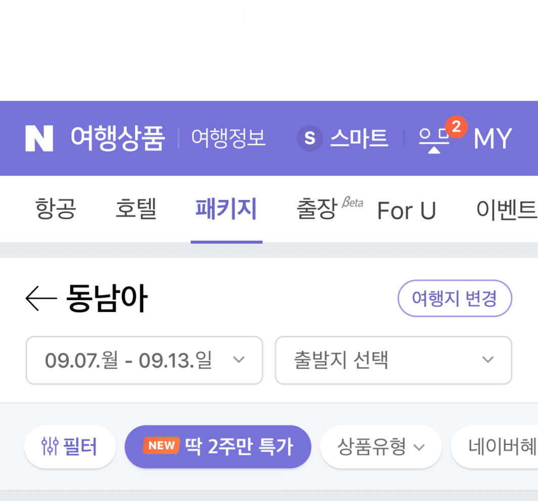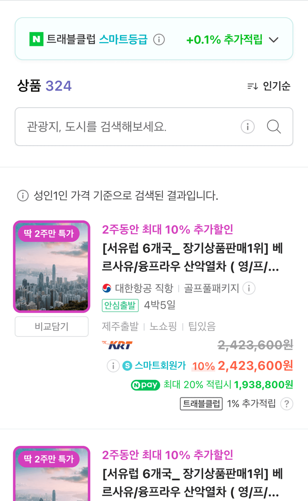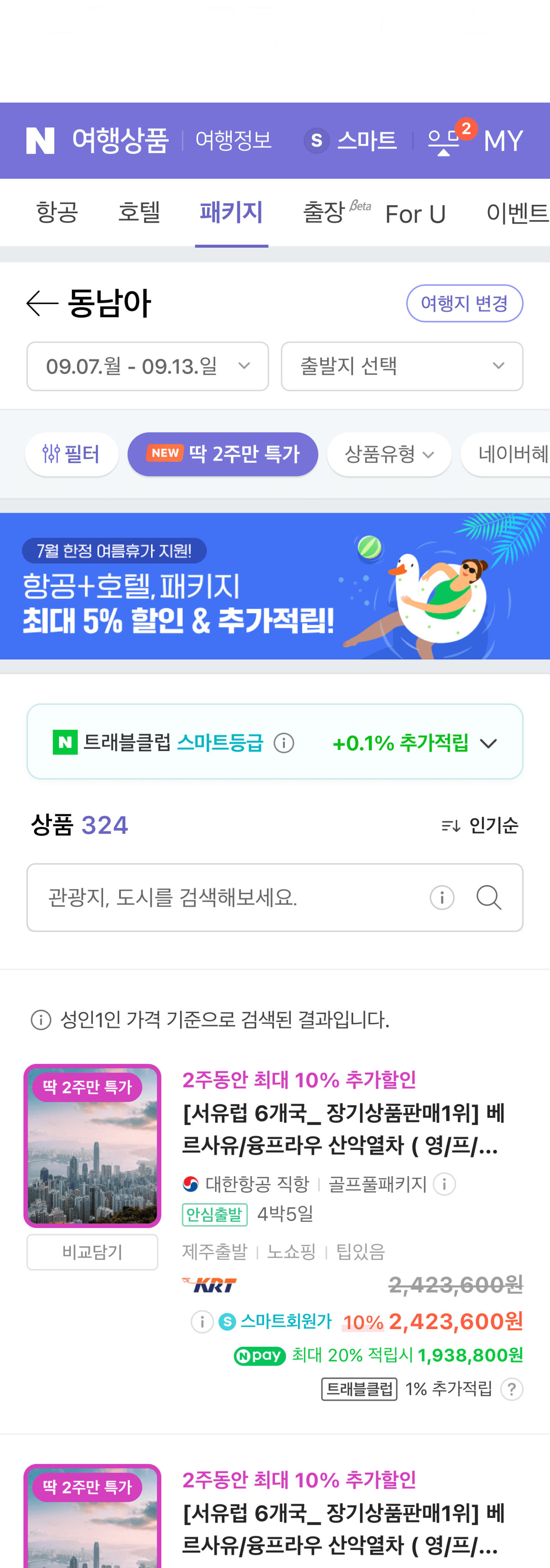 네이버 패키지여행 상품 검색 결과에서