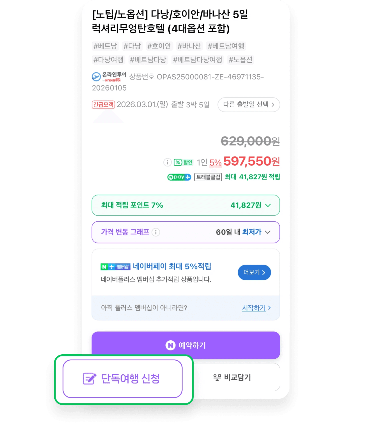 - 단독여행 신청 시 사용한 네이버 ID와 예약에 사용한 ID가 동일해야 합니다.