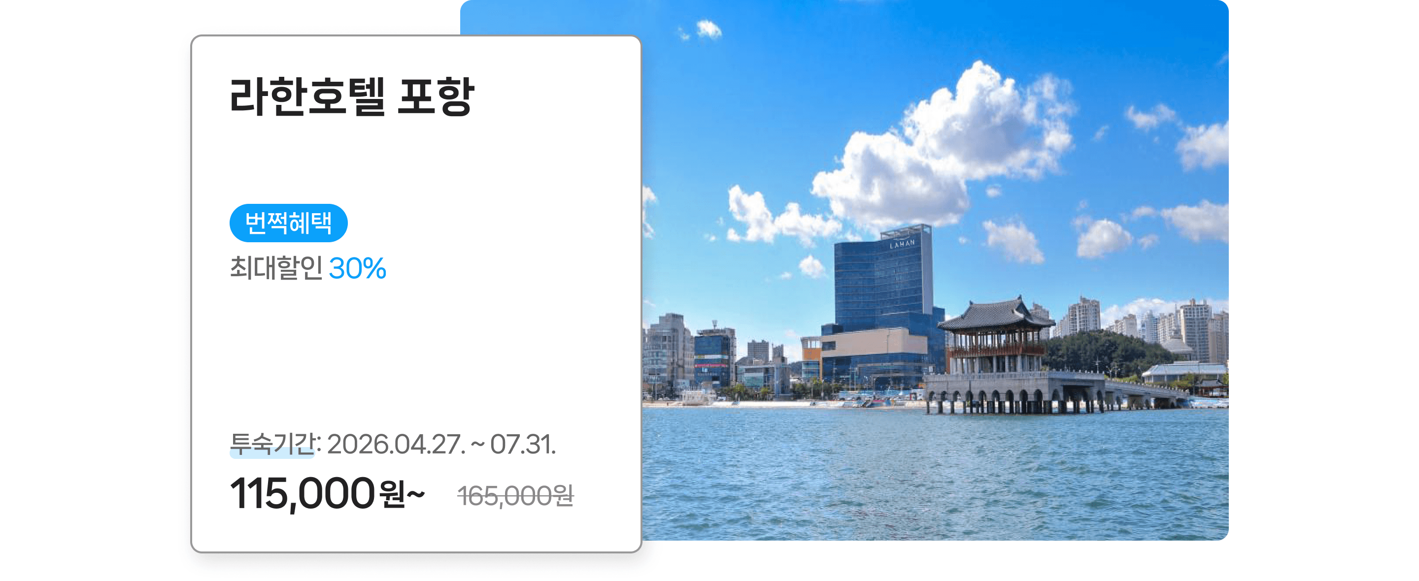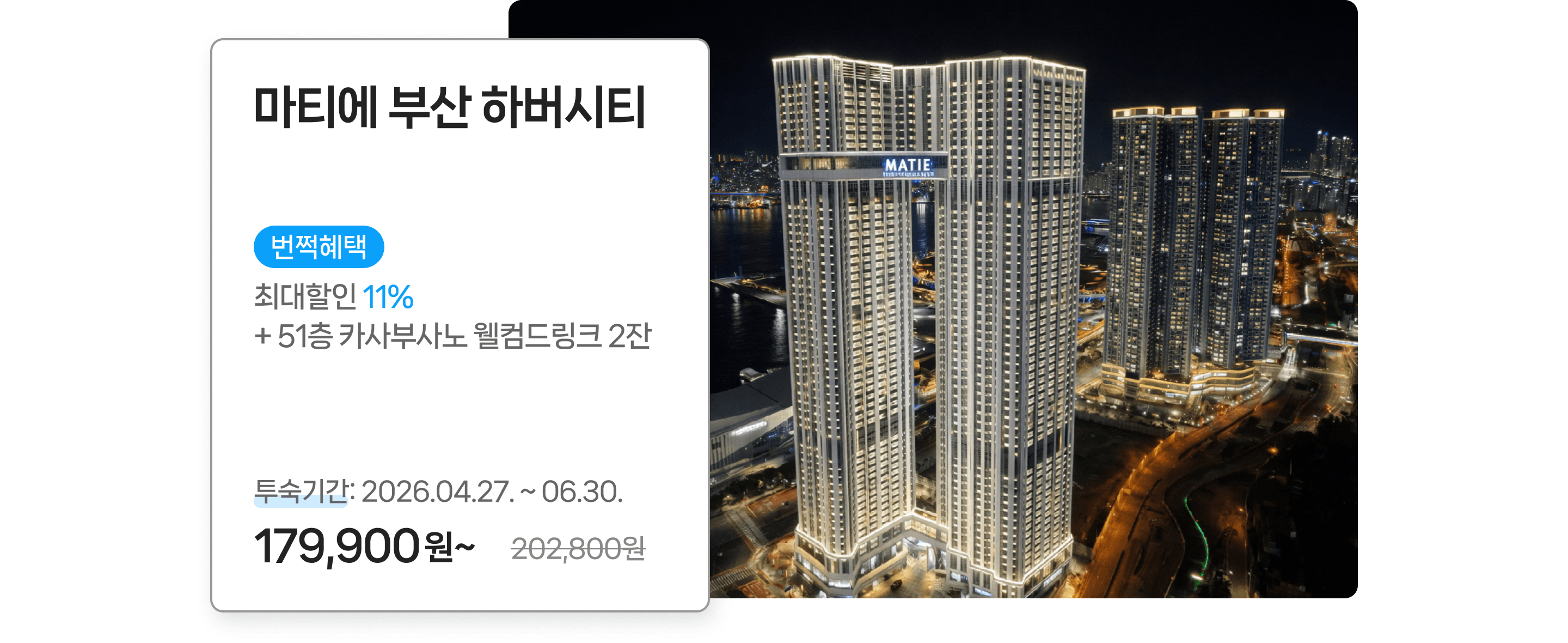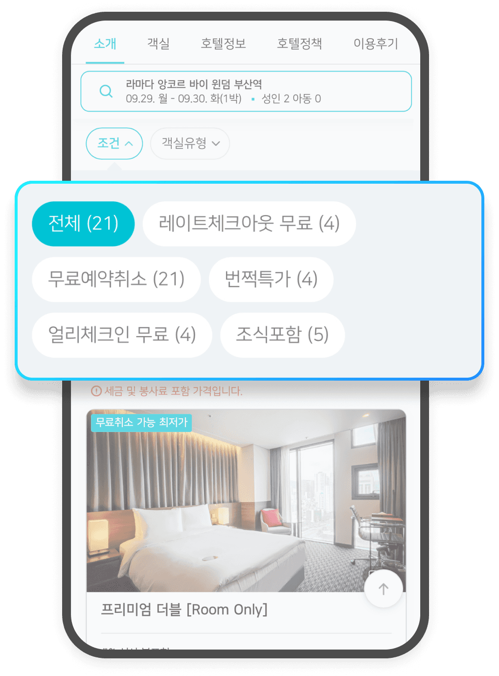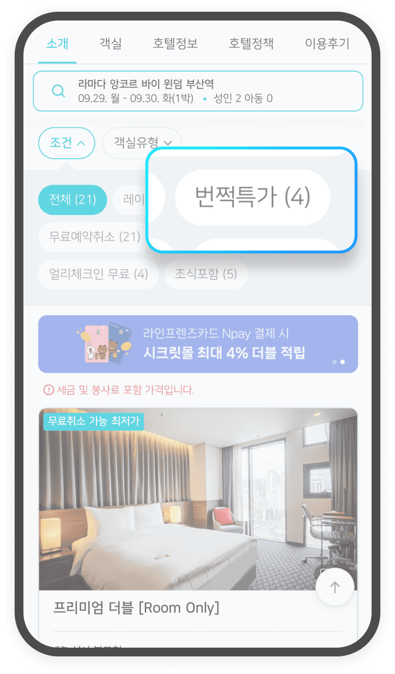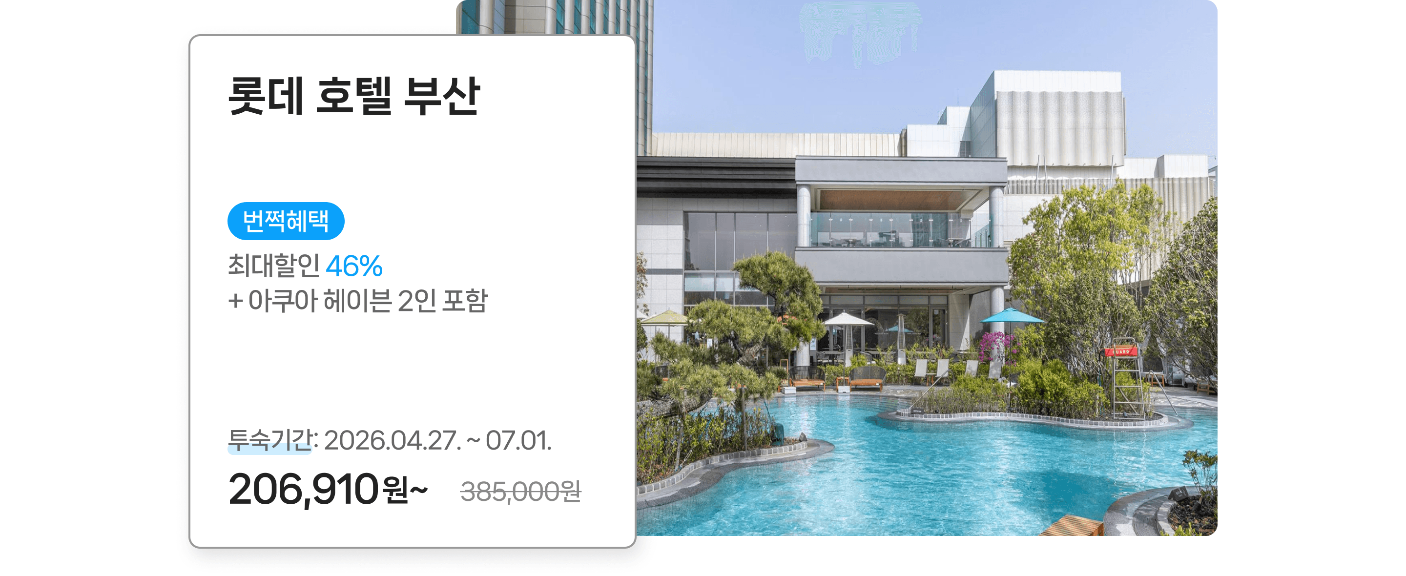 • 각 호텔의 일자별 예약 상황에 따라 객실 재고 및 특가 요금이 변경 또는 마감될 수 있습니다.