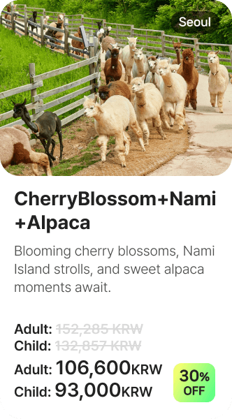 Blooming cherry blossoms, Nami Island strolls, and sweet alpaca moments await.